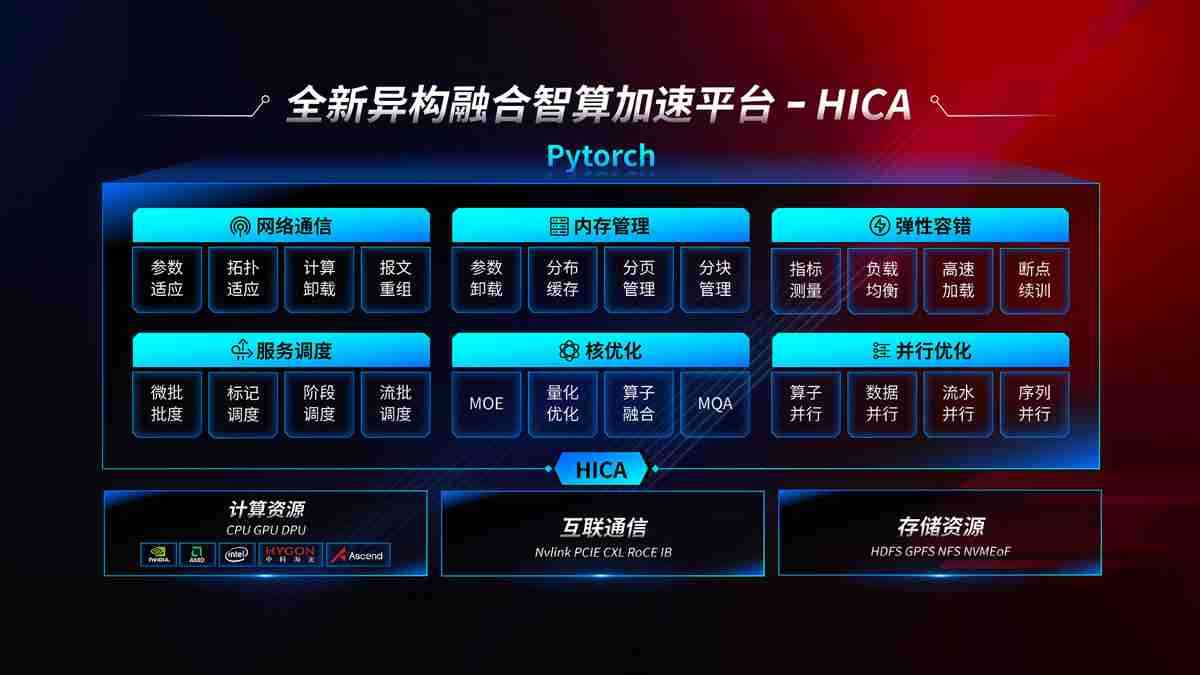 通过自研的服务层、、、、中间适配层、、、以及调度编排算法,,采用数据并行、、、模型并行等多种并行方式,,,把并行计算任务进行有效的分解,,,使其分别由相应的软件栈和算力资源来承接。。。。当GPU资源变化,,HICA可以实时动态调度计算子任务并调整模型拓扑和架构,,,,以充分聚合各种算力资源。。。。